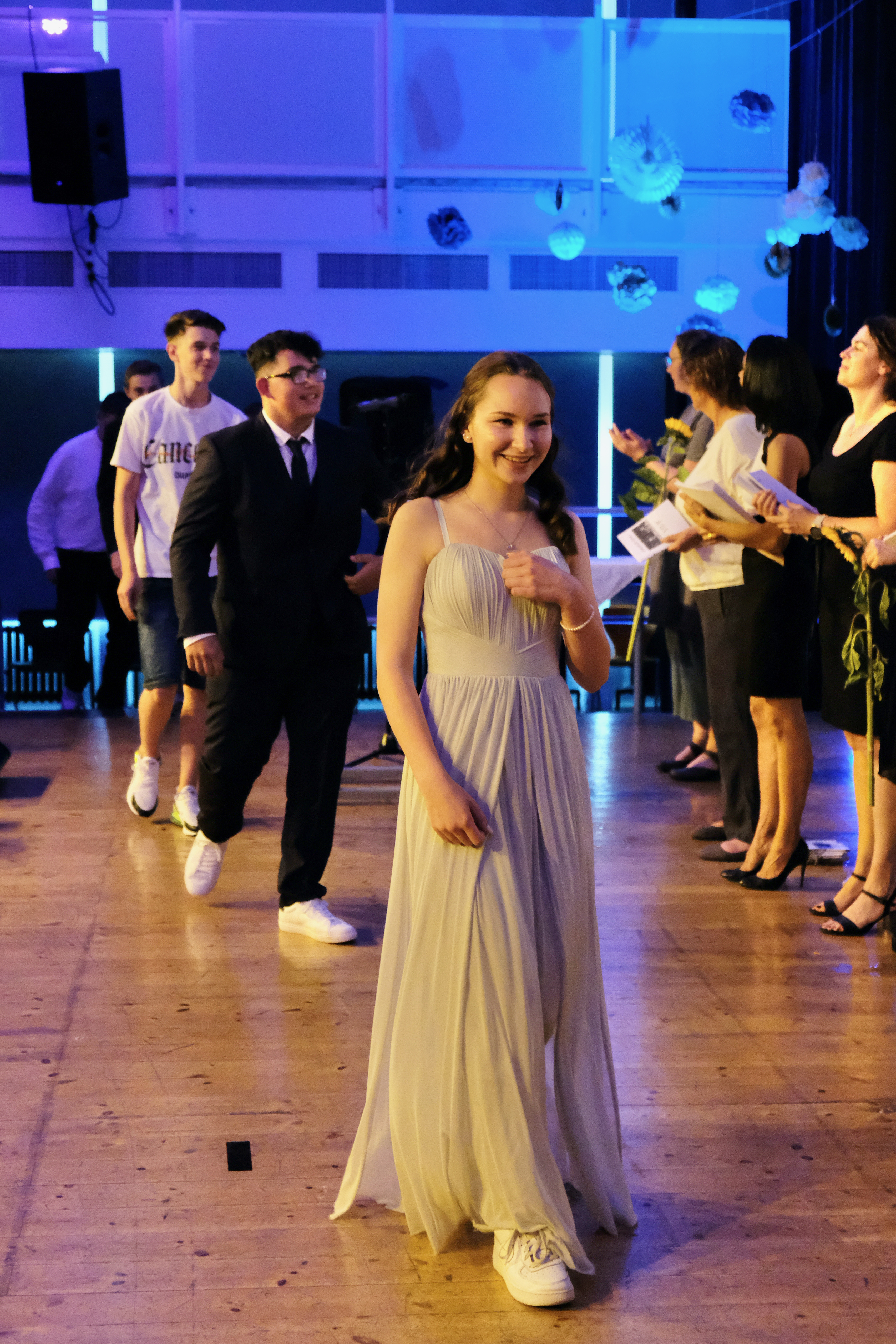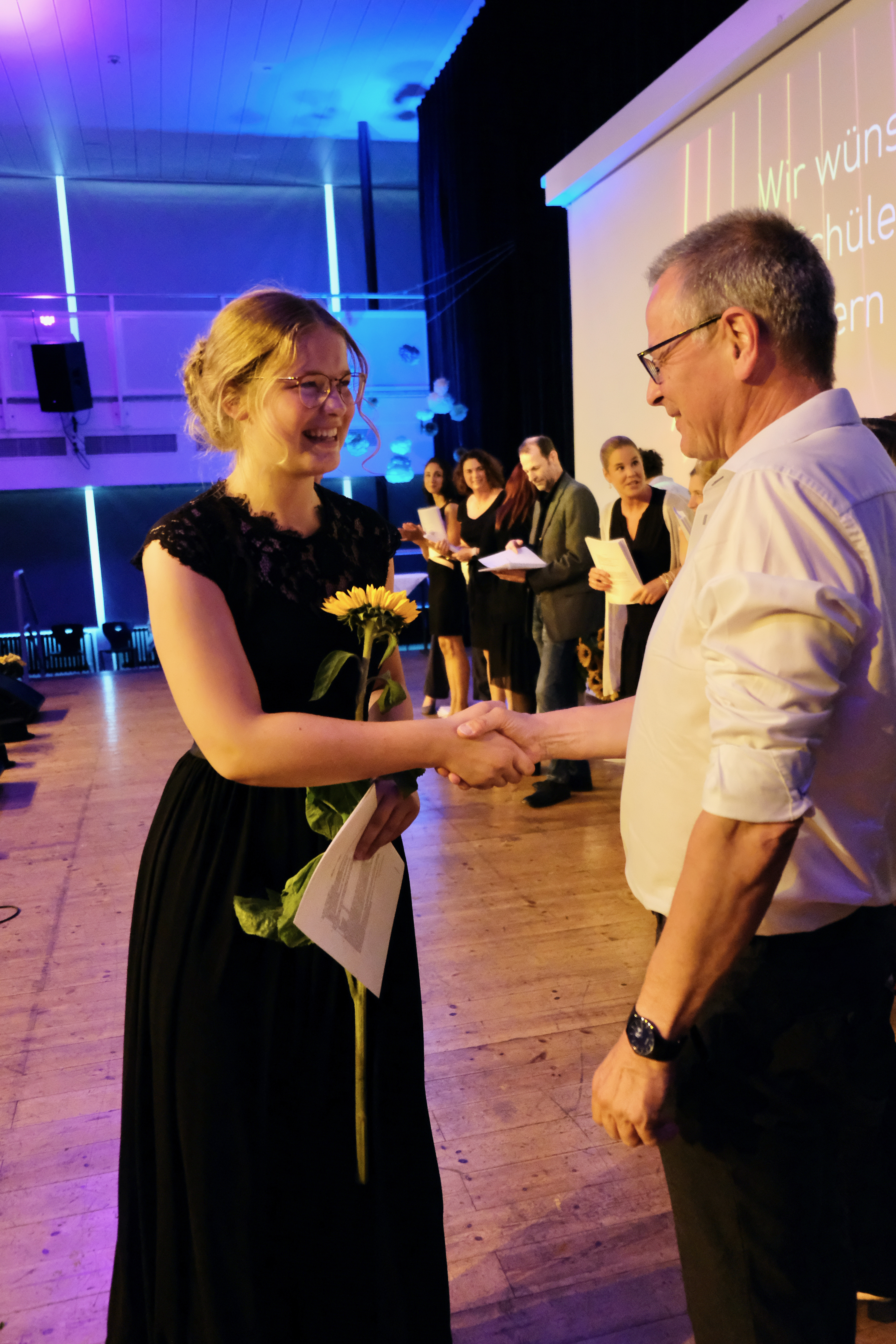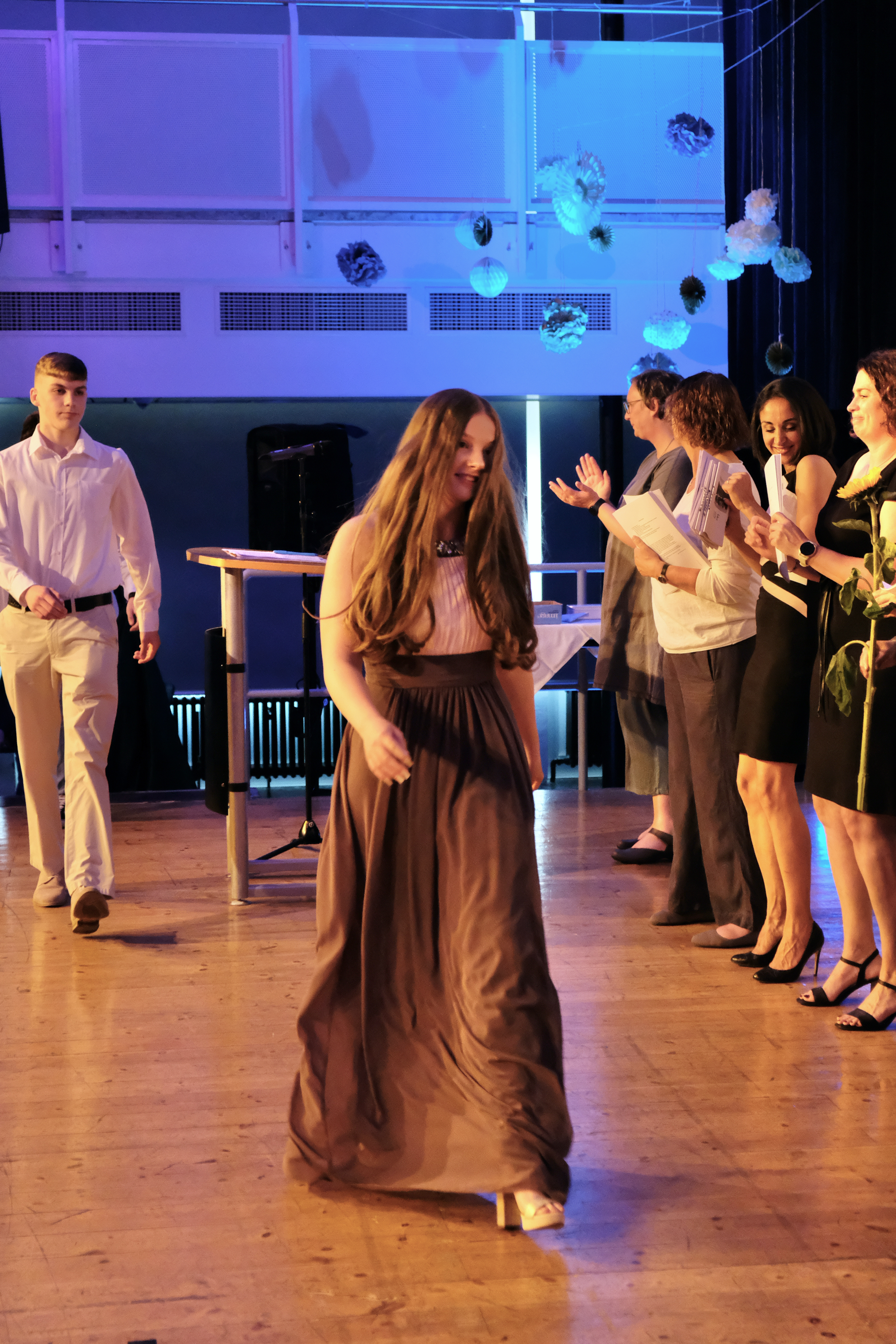 Doch es soll nicht dabei bleiben. Die Zeugnisübergabe, die durch die stellvertretene Schulleiterin Anja Weber moderiert wird, wird gesäumt von einem stimmungsvollen, dem Anlass entsprechend auch melancholischen Gesangsbeitrag der Schülerin Ada Ziehn, die mit Lana del Rays „Born to die“ zu Tränen rührt und Schülersprecherin Luisa Grunschel bedankt sich im Namen der Schülerschaft bei dem Lehrerkollegium für die spannende und schöne Schulzeit und stimmt ihre Mitschüler*innen auf das, was nun folgen wird, ein. Auch die Lehrkräfte möchten ihre guten Wünsche angemessen vortragen und verteilen als gute Feen und Zauberer Blütensamenkonfetti, das symbolisch mit den Wünschen wachsen soll.